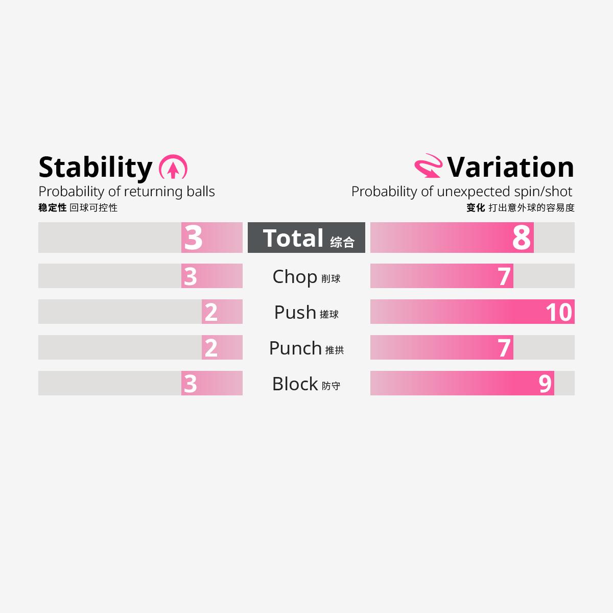 推荐给追求击球变化(打出意外球的容易度)的选手使用的正胶。由于没有海绵,轻量和较低的反弹性是它的特点。