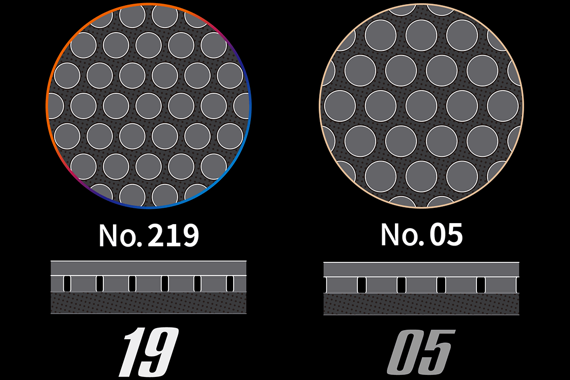 TENERGY 19 所采用的 No.219 颗粒形状(1),其特点是,它在 TENERGY 系列中是比较细的颗粒形状,直径约1.5mm,在遵守规则的情况下尽可能的密集分布在结构中。这就是,蝴蝶在获得「速度与旋转兼备有着高性能的颗粒形状的胶皮」的专利(2)中所选出的颗粒。