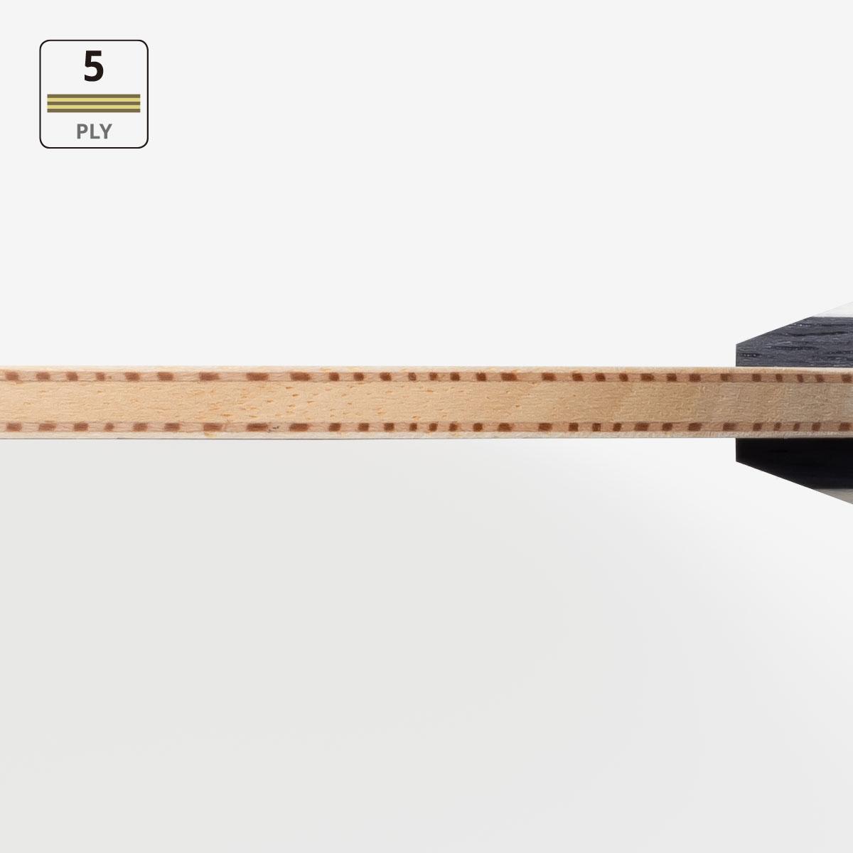 虽然在五层纯木底板中相对较薄,但它具备合适的弹性。HADRAW 5推荐给想要纯木球拍的手感,打起来易于加旋转又不缺冲击力的中级或高水平球员。
