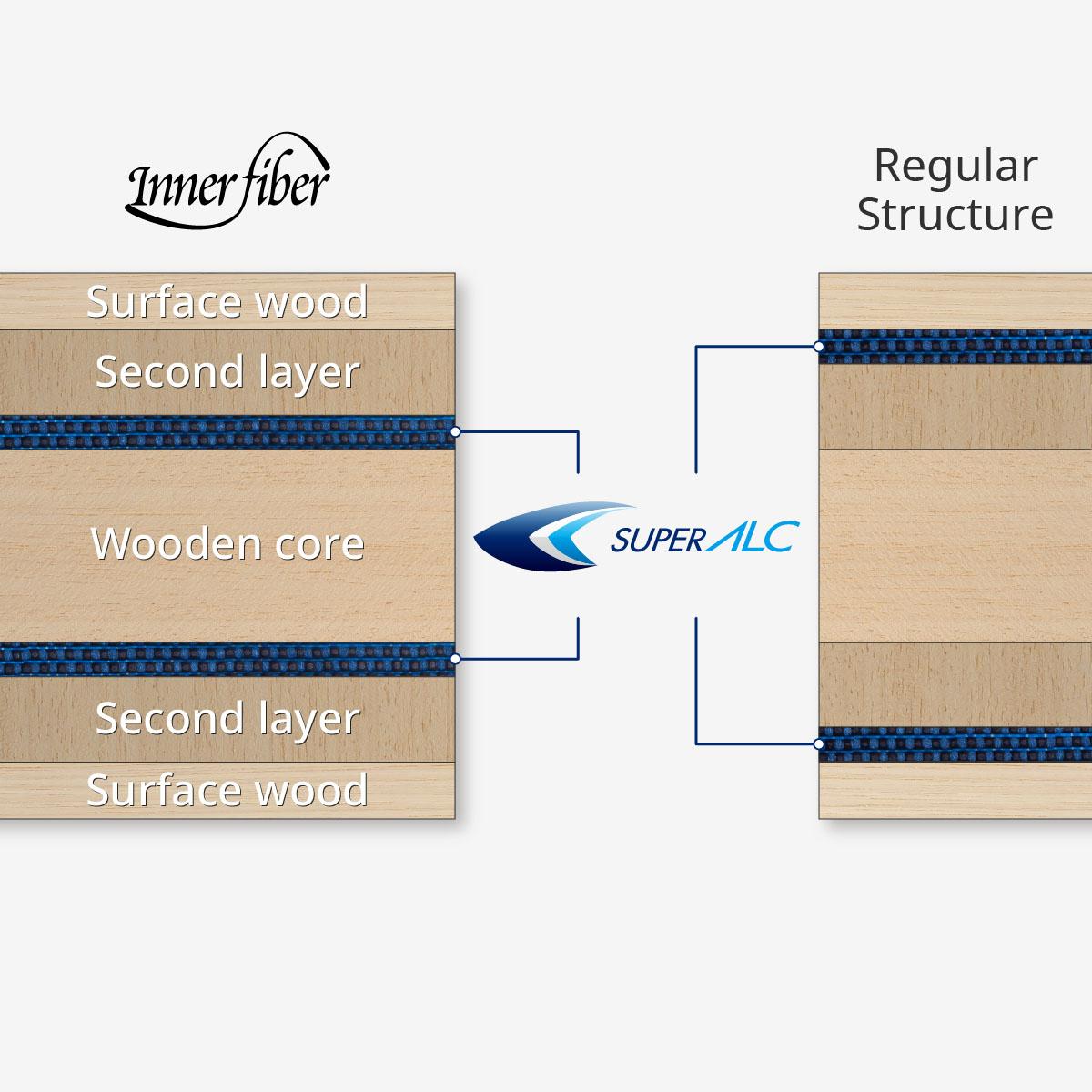 Super ALC纤维成功实现高反弹特性和低振动特性的兼备,加上可带来良好持球感的内置纤维结构,众多技术和配置的搭载,将高弹性和稳定性这两个对立的特性得以巧妙结合。此款底板尤其适合追求中近台稳定且强劲反拉技术的选手。