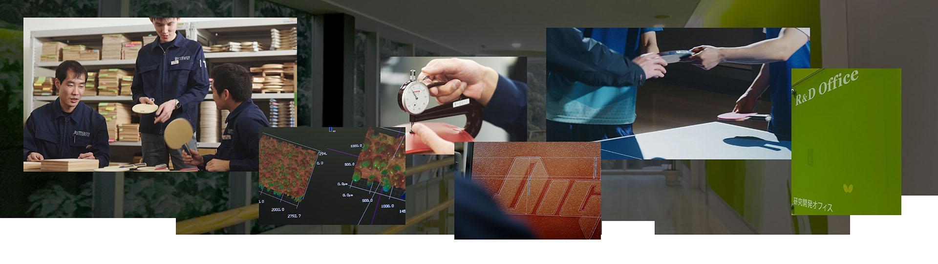 在「蝴蝶技术开发中心」,除了生产蝴蝶品牌的乒乓球拍和套胶外,还进行着研究和开发工作。研究开发部门通过制作大量的试制品,进行多种测量和分析以及选手的试打等各种评估,并花费大量时间,不断多次重复此过程,最终完成器材的开发。在这里,我们将介绍一些研发中不可或缺的步骤,这些球拍和套胶的开发场景,持续地为我们开拓着全新的乒乓球世界。