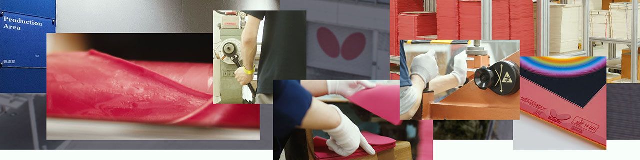 「蝴蝶技术研发中心」是蝴蝶公司对胶皮和球拍的研究、开发、制造的基地。在这里可以生产出流通于全世界的产品,如DIGNICS和TENERGY套胶等。这其中最受热捧的反胶套胶的构造,如图所示分为与球直接接触的胶皮表面以及与胶皮相连接的海绵这两层构造。 ≫关于套胶的种类请点击此