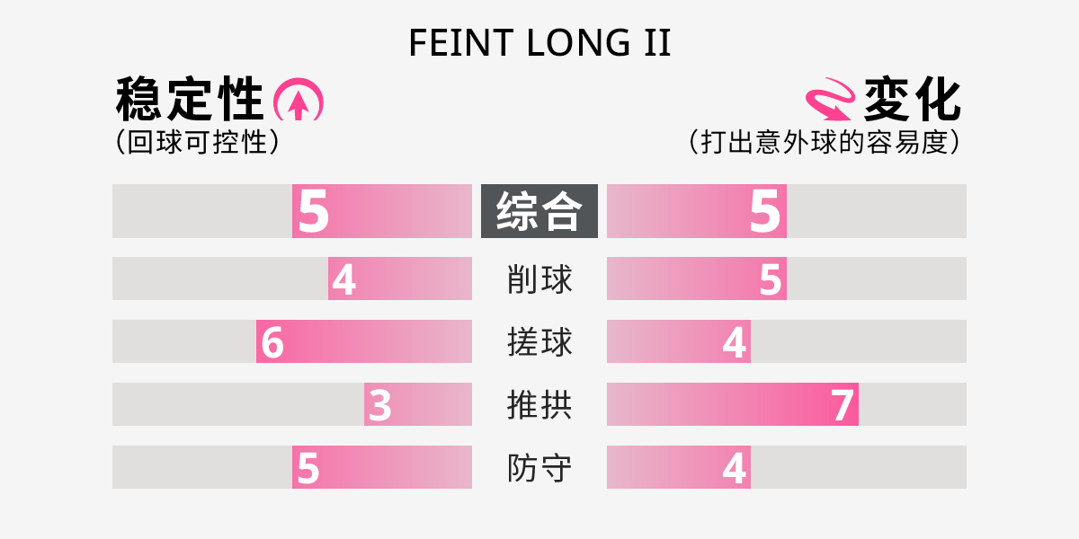 以下的图标显示了长胶套胶的关键特性「稳定性」和「变化(打出意外球的容易度)*」。它还分别表示了长胶运用上的几项重要技术评估。