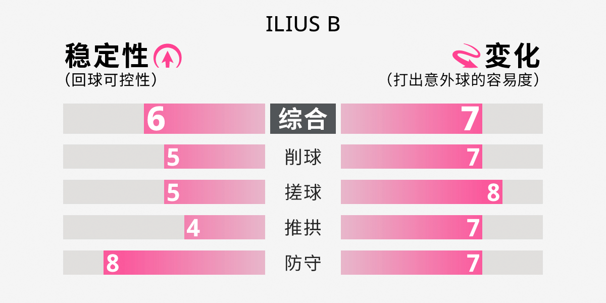 ILIUS B 是首次采用蝴蝶独自研发的 Absorber Sponge Drop 海绵的长胶。为了激发出套胶的特性而设计出规则极限所允许的颗粒形状比例的较硬胶皮和 Absorber Sponge Drop 相结合。不但在长胶特有的“磕”的技术上可以回球不出台,也可以“拱推”出敏锐的下沉球,因此在攻防技术上都可以发挥出其高性能。