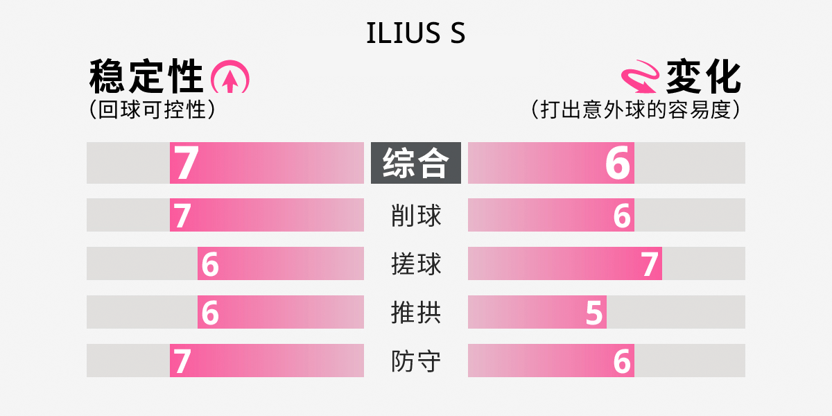 ILIUS S 是首次采用蝴蝶研发的 Absorber Sponge Heavy 海绵的长胶。为了激发出套胶的特性而设计出规则极限所允许的颗粒形状比例的较硬胶皮和 Absorber Sponge Heavy 海绵相结合。不但可以制造出下沉球,更可以轻松应对对方的强打以及制造出弧线低,旋转强的下旋球。推荐给注重回合的稳定性,以及旋转变化多端的削球选手使用。