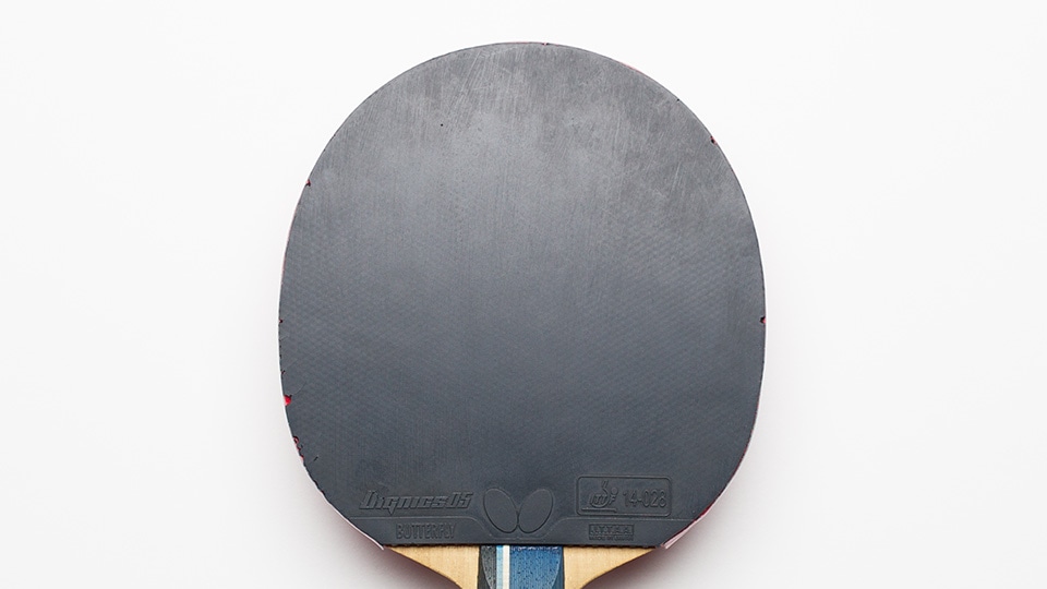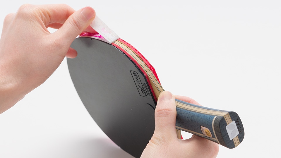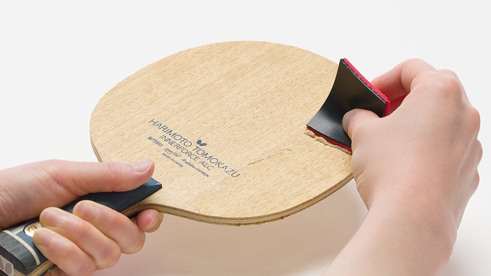 用撕下来的套胶其中的一个边角,将底板上所残留的胶水清除。如不将底板上的残留物清除干净就粘上新套胶的话,会使粘好的套胶凹凸不平,这也可以使套胶更容易粘贴。